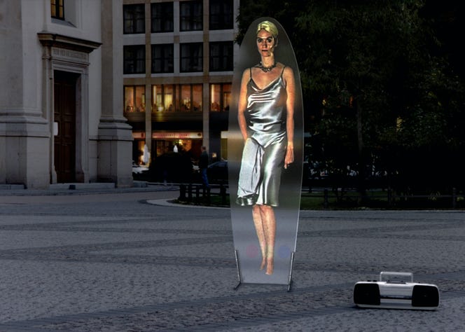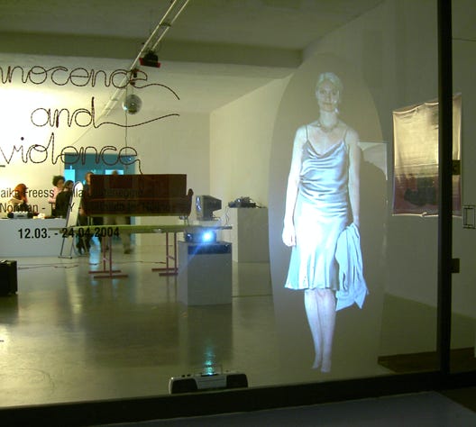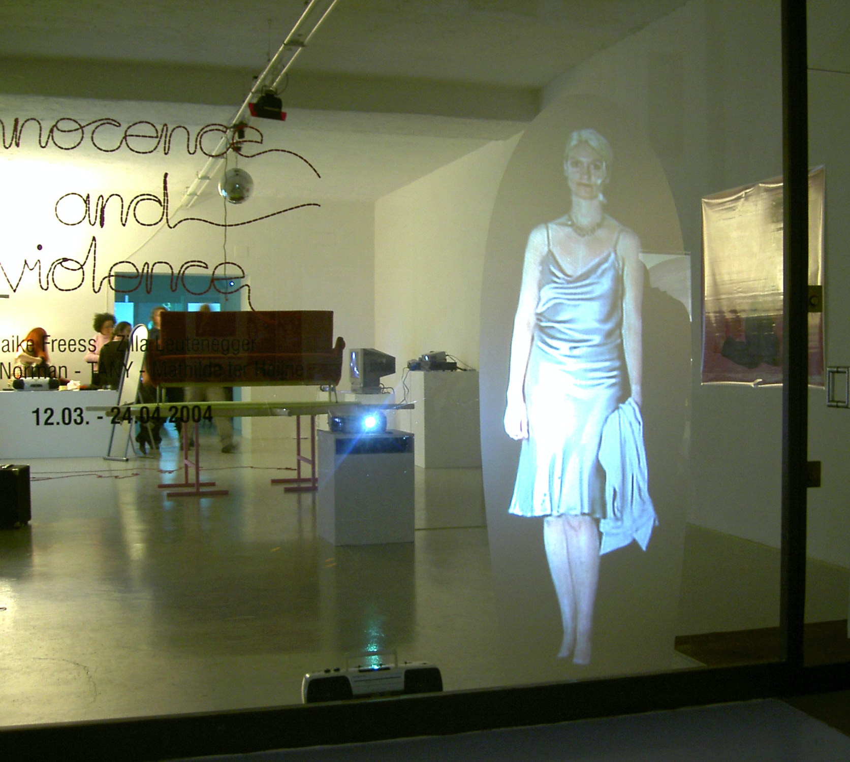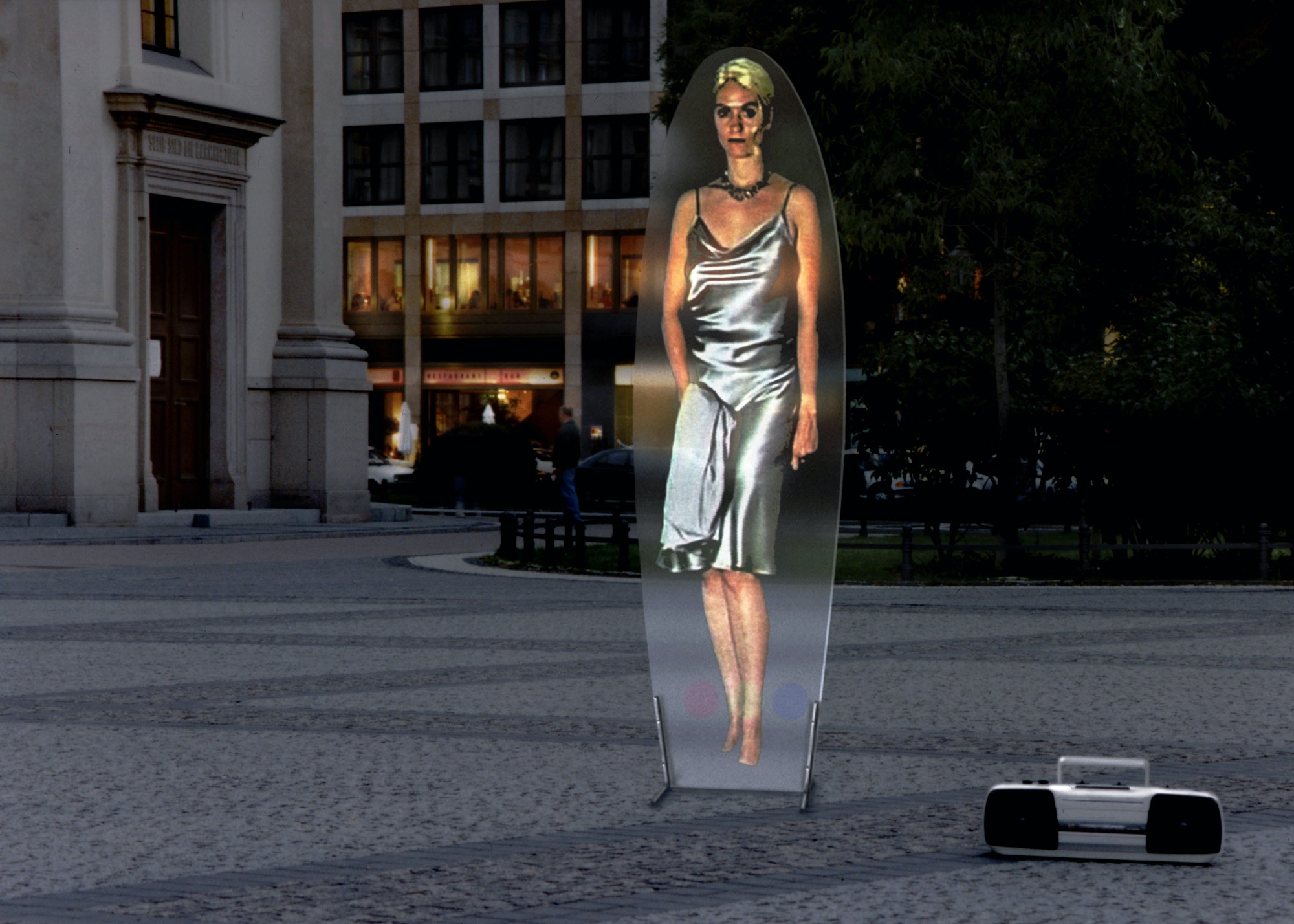 1999, video projection on acrylic glass, sound, player, 175 x 60 cm
