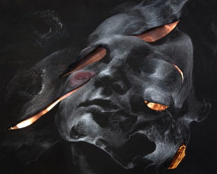 various crayons, copper, paper cut-out on paper, 40 × 30 cm
