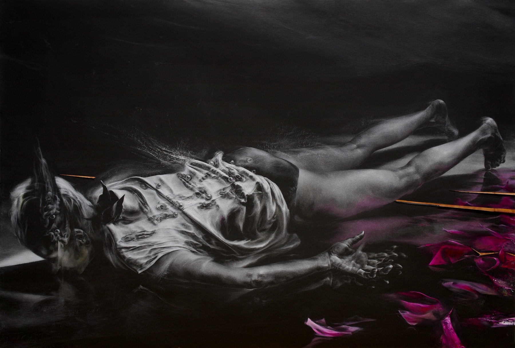 various crayons, oil, paper cut-out, copper on paper, 136 x 200 cm