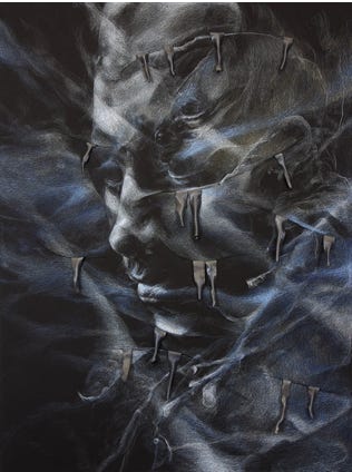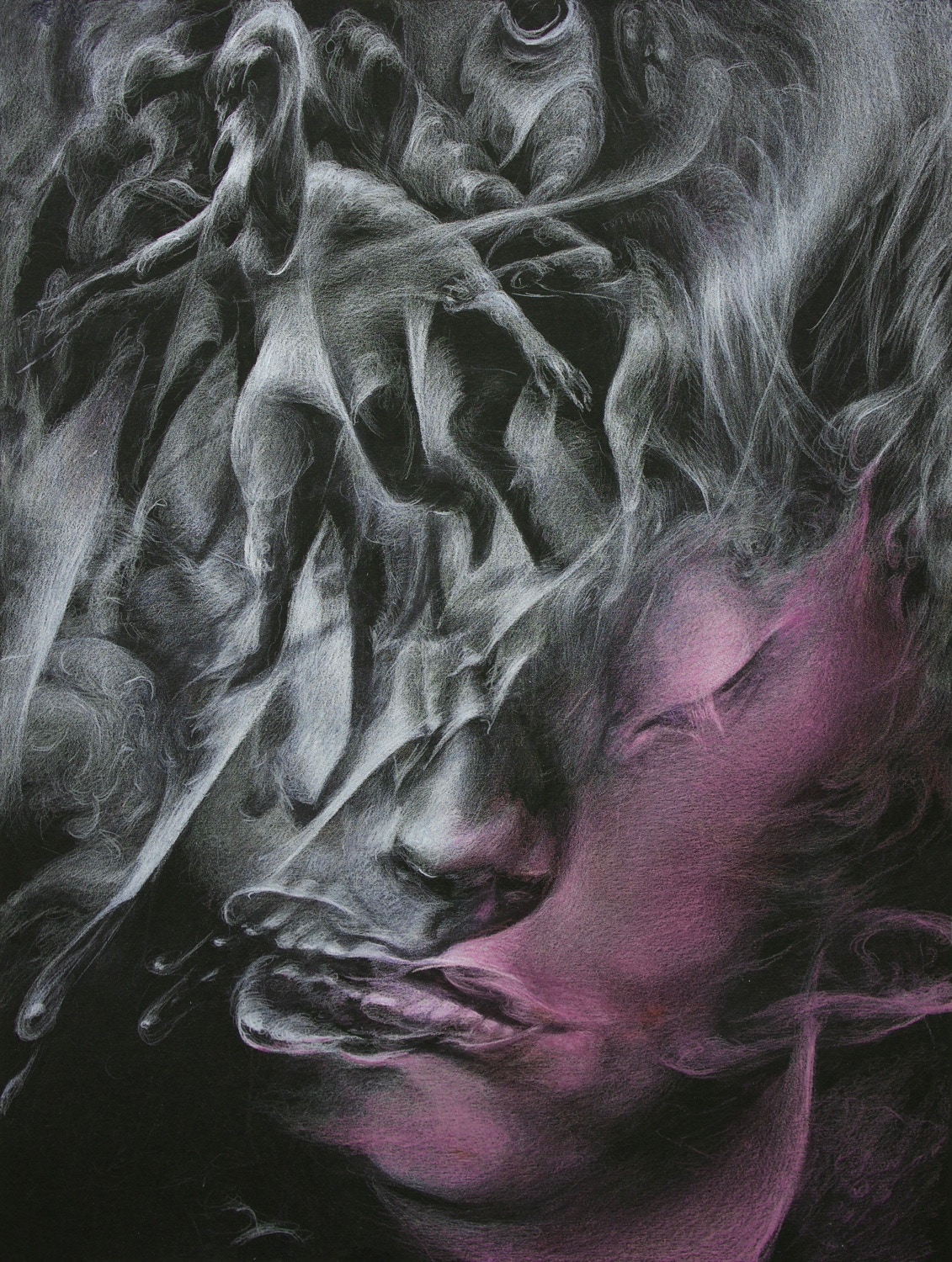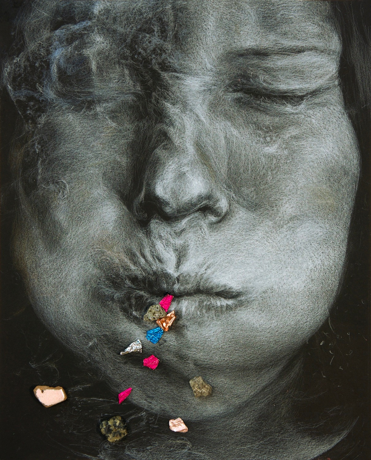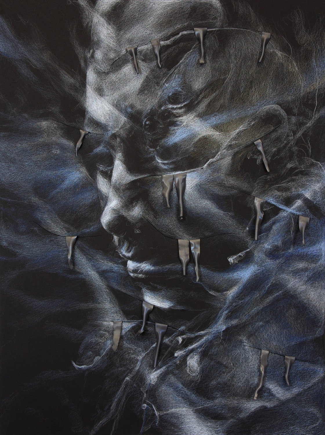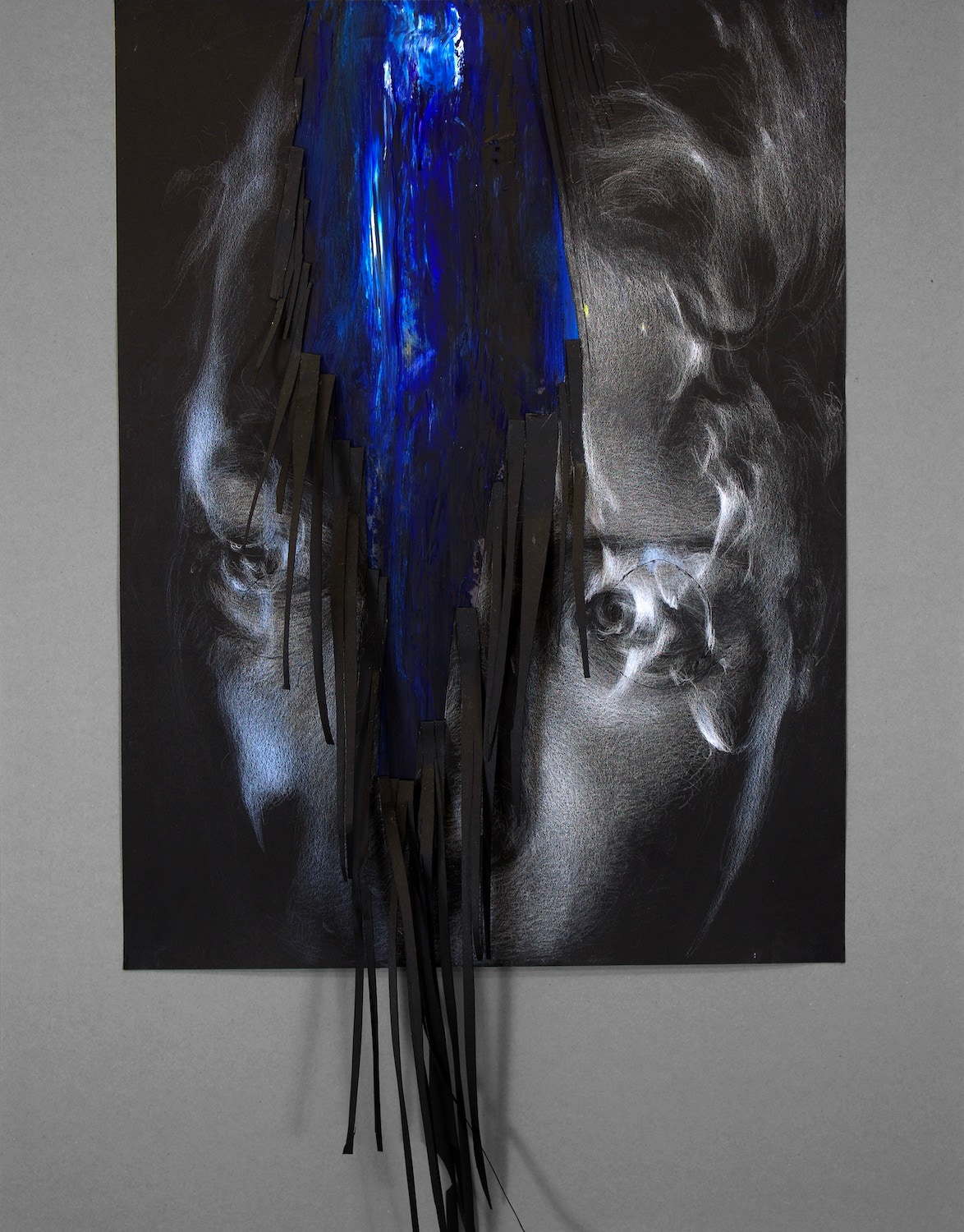 various crayons on paper, plumbum, paper cut-out on paper, 40 × 30 cm