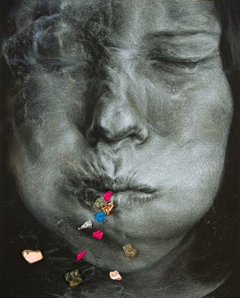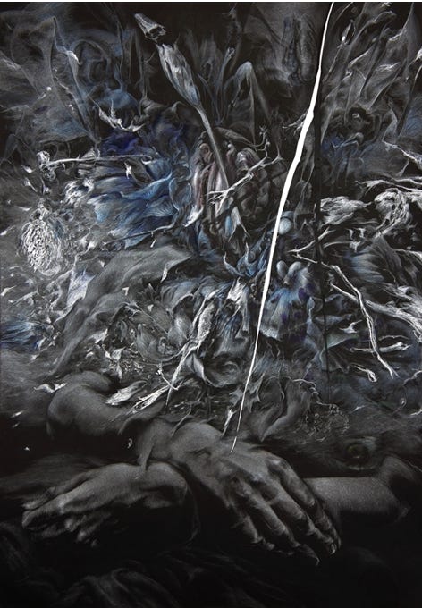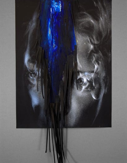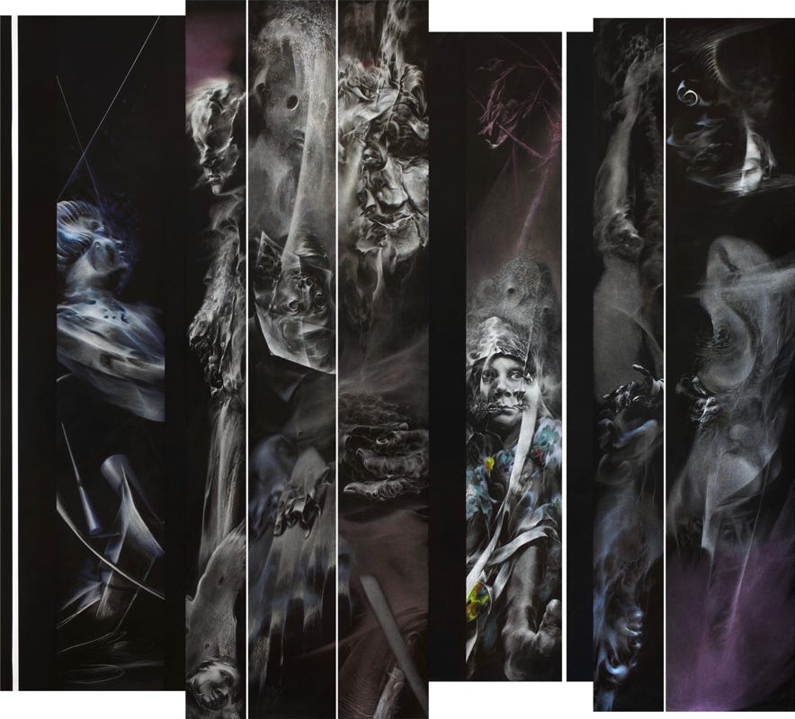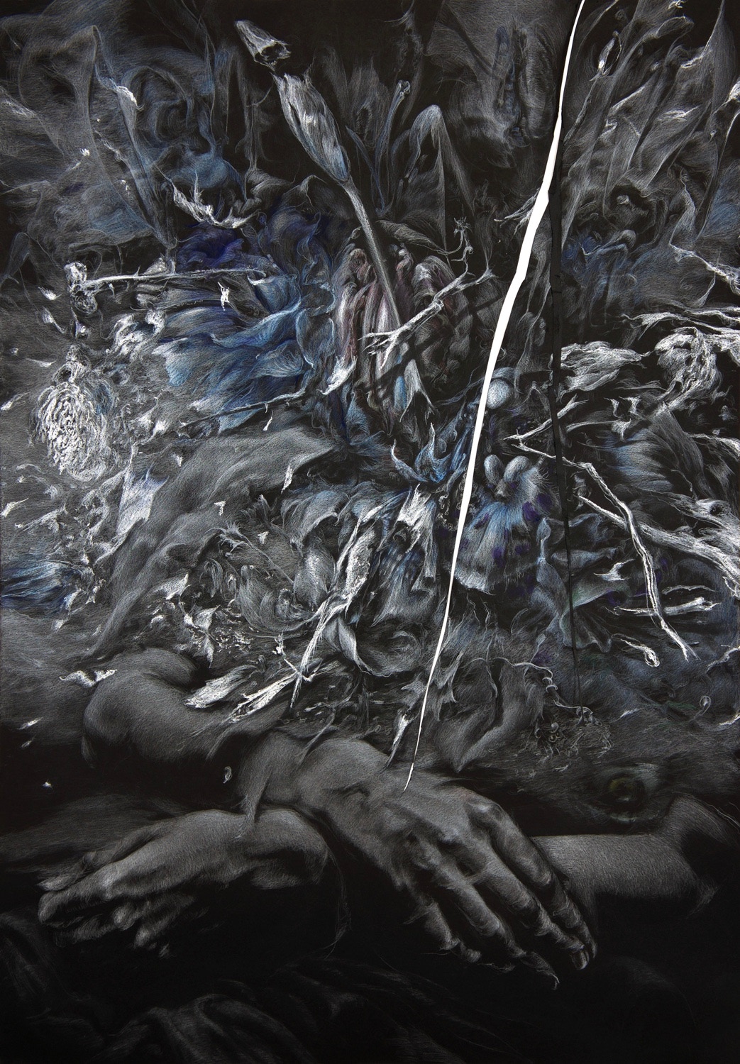 various crayons, oil, paper cut-out, copper on paper, 136 x 200 cm