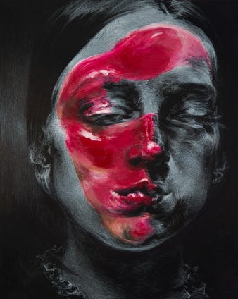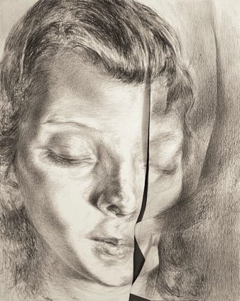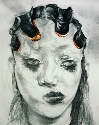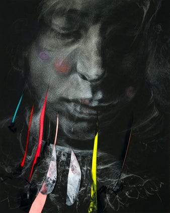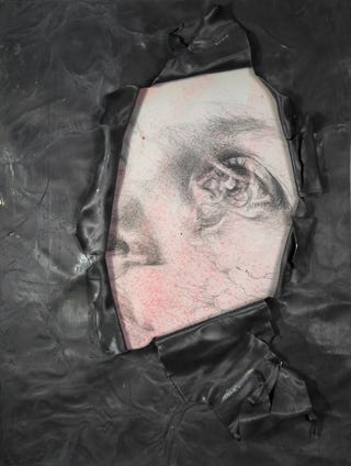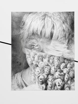 graphite, various crayons, ink, plumb on paper, 30 × 25 cm