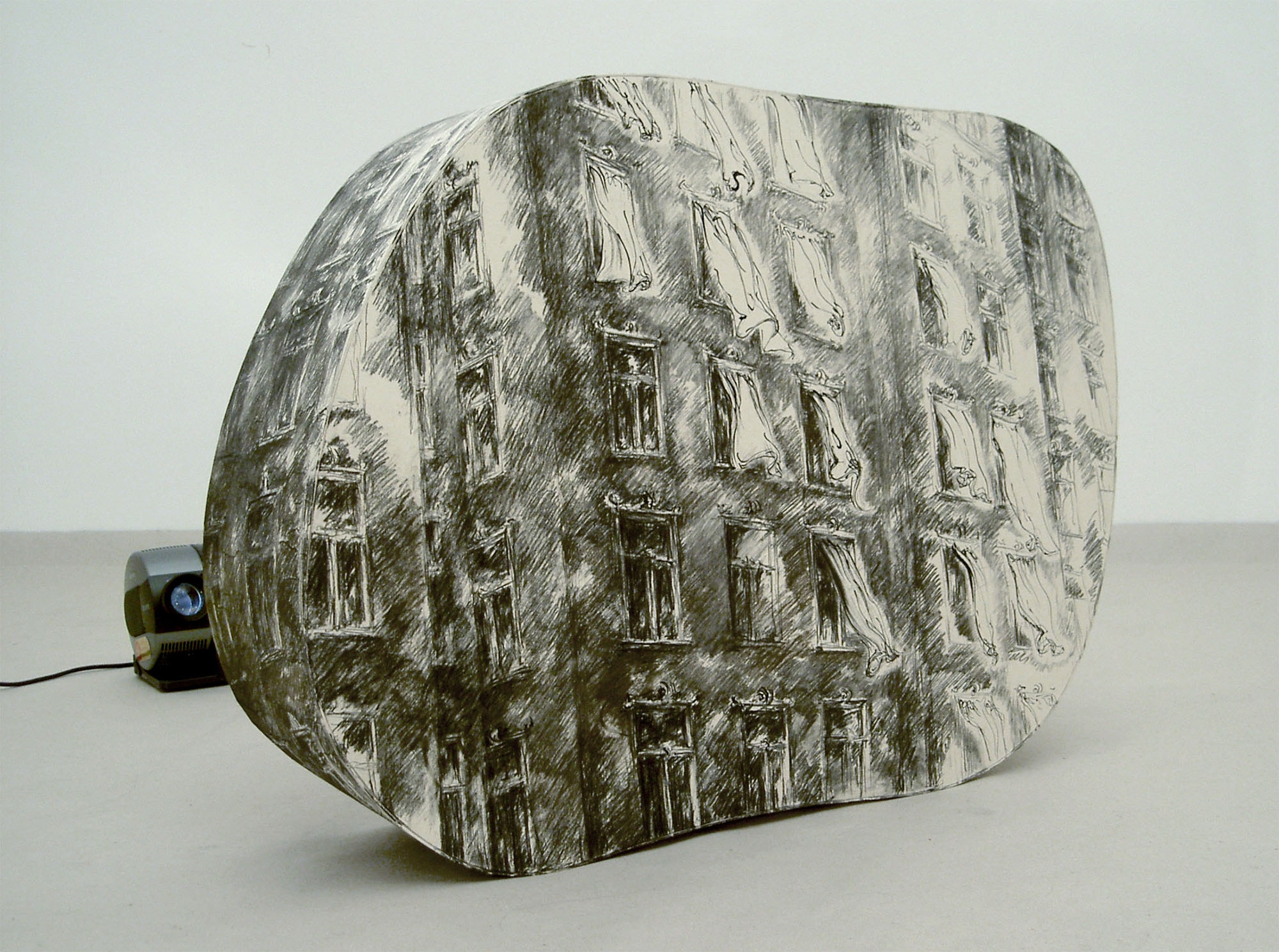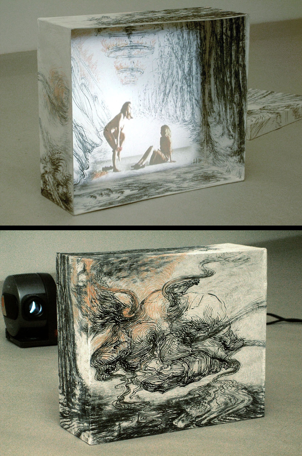 DVD video projection / 10 min / loop, sound, cardboard with drawings, 60 x 80 x 20 cm