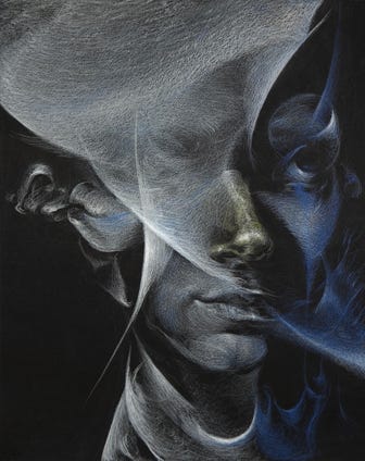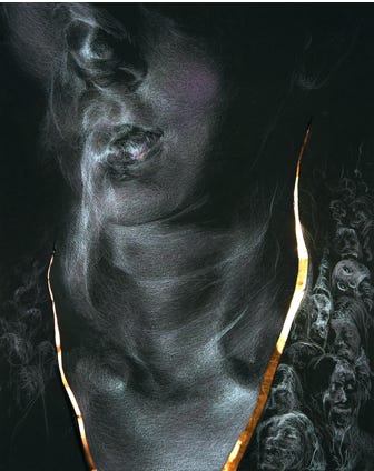 graphite, various crayons, ink, plumb on paper, 30 × 25 cm